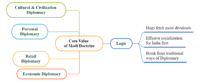 - Another very crucial dimension of the Modi doctrine is his thrust on economic diplomacy. All diplomatic engagements undertaken by Modi till date are driven by the economic thrust of making India a commercial power.